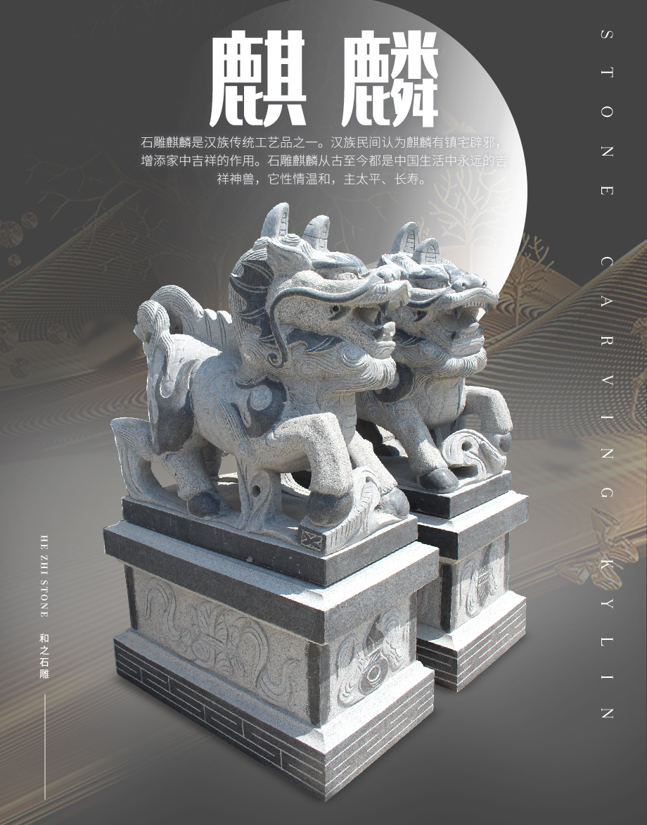 麒麟是我們中華幾千年來的傳統(tǒng)神獸之一,是上古神獸。與鳳、龜、龍共稱為“四靈”,是神的坐騎。我們和之園林雕刻的這款石雕就是以麒麟為題材,精選優(yōu)質(zhì)芝麻灰雕刻而成,把麒麟集獅頭、鹿角,虎眼、麋身、龍鱗于一體的形象造型,淋漓盡致的展現(xiàn)出來。