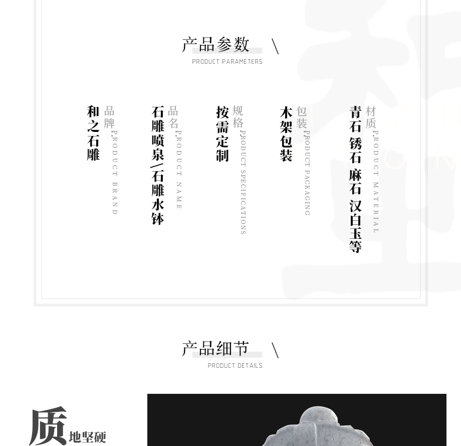 此款石雕噴泉水缽是兩層式造型,選用優(yōu)質(zhì)芝麻白花崗巖加工而成,在風格上偏中式些,兩層大小不一樣,而且我們可以看到兩層的雕刻線條也是不一樣,可以看出越小的一層,雕刻的線條會顯得更細膩。整體的水缽雕刻線條都非常的勻稱而且線條美觀十足。在水缽的頂部,我們可以看到雕…