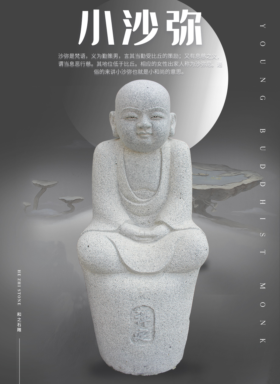 寺院常用小沙彌雕刻造型提供六度小和尚雕刻圖片,高度一般在0.6-1.2米,石材選用福建優(yōu)質(zhì)芝麻白石料,六度小和尚造型要比一些在公園常見(jiàn)的挑水,下棋,打功夫等小和尚禪意更足。何謂六度,六度即為六波羅蜜,布施、持戒、忍辱、精進(jìn)、禪定(止觀)、智慧,是六種人生修行的方法。