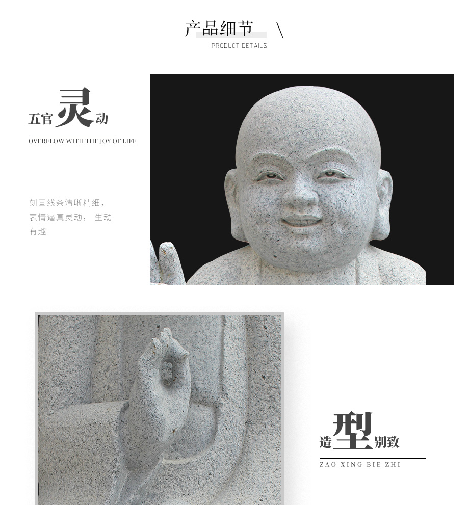 由福建惠安和之園林古建公司雕刻六尊小和尚造型栩栩如生,憨態(tài)可掬的形象惹人喜愛(ài)。每一尊小和尚手印各不相同,但是都跏趺坐姿在相應(yīng)的名字的石座上,智慧小和尚右手捧腮,忍辱小沙彌雙手合掌,禪定小和尚做禪定印,兩手平放于腿上,一掌置于另一掌之上,持戒小和尚右手做說(shuō)法印,左手仰放腹前,布施小和尚則俏皮的做起比耶的勝利手勢(shì),天真可無(wú)邪。六度小沙彌工藝品擺件適合擺放在寺院或者宗教性質(zhì)相關(guān)的場(chǎng)所,這類具有佛教特色的石雕小人物,但又很生活化的雕刻品生動(dòng)形象,深受人們的青睞,歡迎來(lái)廠參觀批發(fā)。