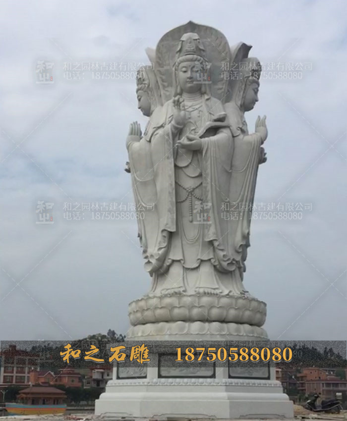 自佛教傳入中國,佛教文化在中華大地遍地開花,觀音菩薩在中國收獲了一大片的粉絲。觀音菩薩很多形象也被人們雕刻出雕像擺件進行擺放,在公園、文化廣場、文化園、寺廟、佛教活動場所、家居佛堂等,都能見到大大小小的觀音雕像。其中小型觀音造像以滴水觀音、白衣觀音最為常見,大型觀音則以四面觀音、三面觀音這種以多種觀音造像組合的大型石雕像擺放的比較多,需求量也比較大。本文就以石材和寓意兩個方面來了解四面觀音石雕像。