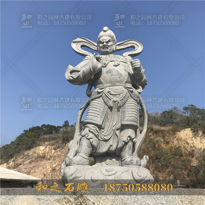 花崗巖招杜羅神將石雕像,招杜羅意譯為執(zhí)動(dòng),其意思是嚴(yán)幟、殺者;另名照頭羅,其意思是月光、月色。招杜羅神將威嚴(yán)起來就像是要?dú)⑷艘粯樱鍍羝胶蜁r(shí)又像是月色一樣??芍^是靜如處子,動(dòng)如脫兔。招杜羅神將的法身為金剛手菩薩,是丑時(shí)之守護(hù)神。通身全白色,現(xiàn)忿怒形,頭戴牛冠,右手把橫劍,左手開掌執(zhí)劍尖,其神態(tài)威武莊嚴(yán)。