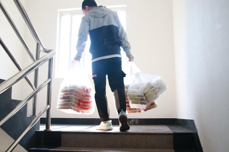 后勤保障組主要負(fù)責(zé)全體人員的餐飲無接觸配送、采購物資的分發(fā)等。每日訂餐結(jié)束后,志愿者從后臺導(dǎo)出訂餐人員信息,整理出每樓層的總訂餐數(shù)、房間號及份數(shù)清單,為餐食的分發(fā)提前做好準(zhǔn)備。志愿者取餐后按清單快速分揀各樓層所需餐食,各樓層餐食分配完成后,統(tǒng)一通知開門取餐,極大的減少了員工之間的接觸,大幅提高了配餐的效率,確保員工可以吃上熱乎的午餐和晚餐。目前每日送餐量接近400份,單樓層最大配送量超過80份,經(jīng)過配送流程優(yōu)化后,每層在5-8min即可完成無接觸送餐,效率大大提高。