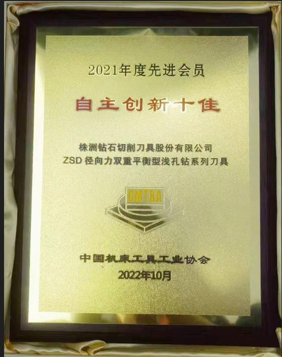 2023年4月10日,公司憑借“ZSD徑向力雙重平衡型淺孔鉆”系列刀具,榮獲機床工具行業(yè)2021年度自主創(chuàng)新十佳獎。