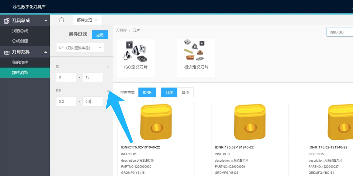 You can select inserts from your own parts library online, and the system automatically matches the optional tool holder bythe ISO13399 standard interface code.