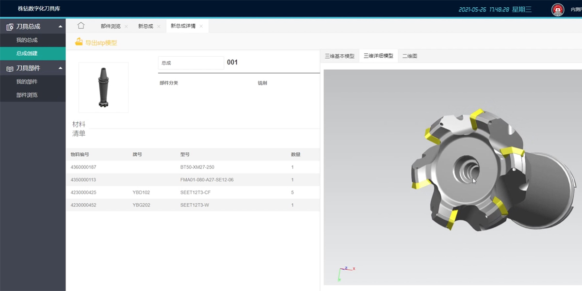 1. Users can assemble tools online by exporting3D models, engineering drawings and STEP files of the parts of the tools to builda personalized virtual tool library and realize optimized cutting tool solutionsat lower cost.