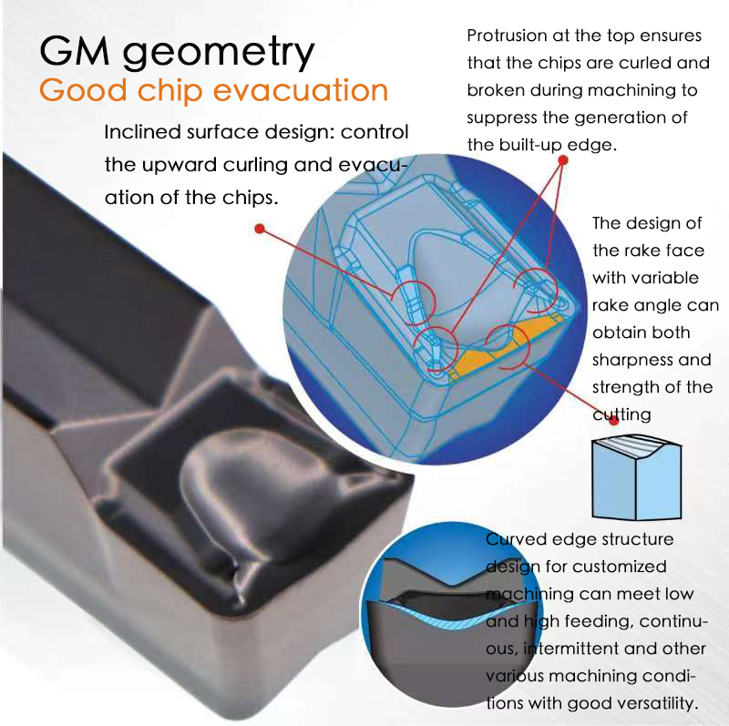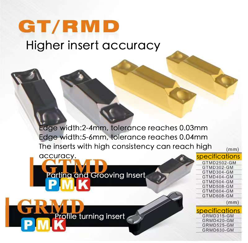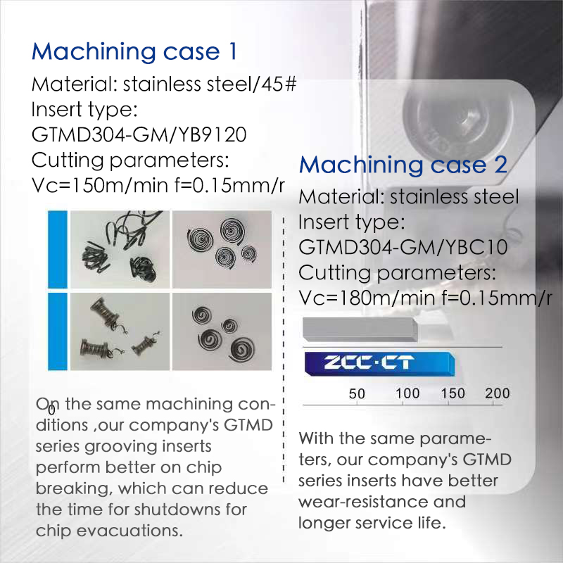 On the same machining conditions ,our company's GTMD series grooving inserts perform better on chip breaking, which can reduce the time for shutdowns for chip removals.