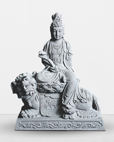 福建惠安和之園林古建雕刻的這尊文殊菩薩按頂髻的形狀來分,屬于五髻文殊,石雕文殊菩薩手持玉如意,以示吉祥,代表智慧,同時又給人們帶來吉祥如意;腳踩蓮花,代表清凈;騎乘獅子,以獅吼威風(fēng)震懾魔怨,表示菩薩智慧威猛。