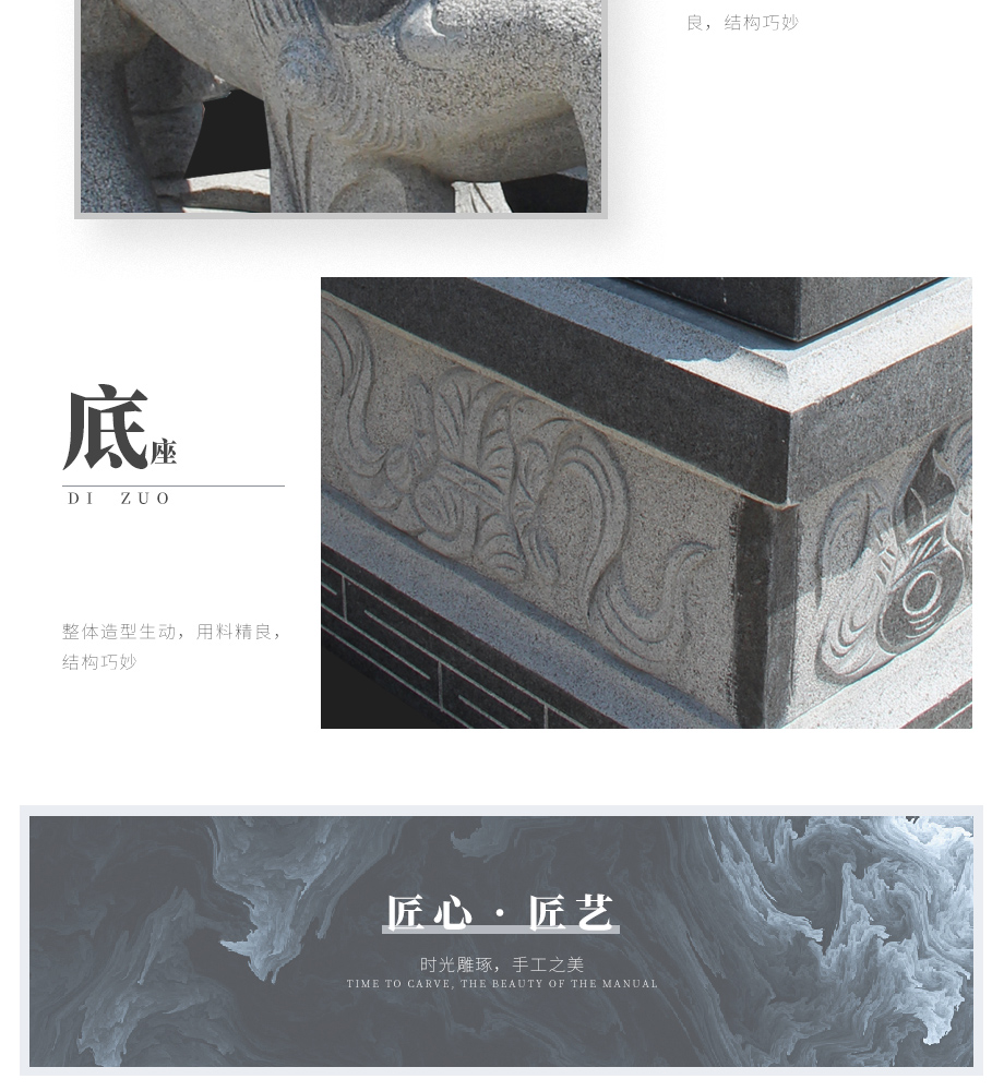 麒麟是我們中華幾千年來的傳統(tǒng)神獸之一,是上古神獸。與鳳、龜、龍共稱為“四靈”,是神的坐騎。我們和之園林雕刻的這款石雕就是以麒麟為題材,精選優(yōu)質(zhì)芝麻灰雕刻而成,把麒麟集獅頭、鹿角,虎眼、麋身、龍鱗于一體的形象造型,淋漓盡致的展現(xiàn)出來。