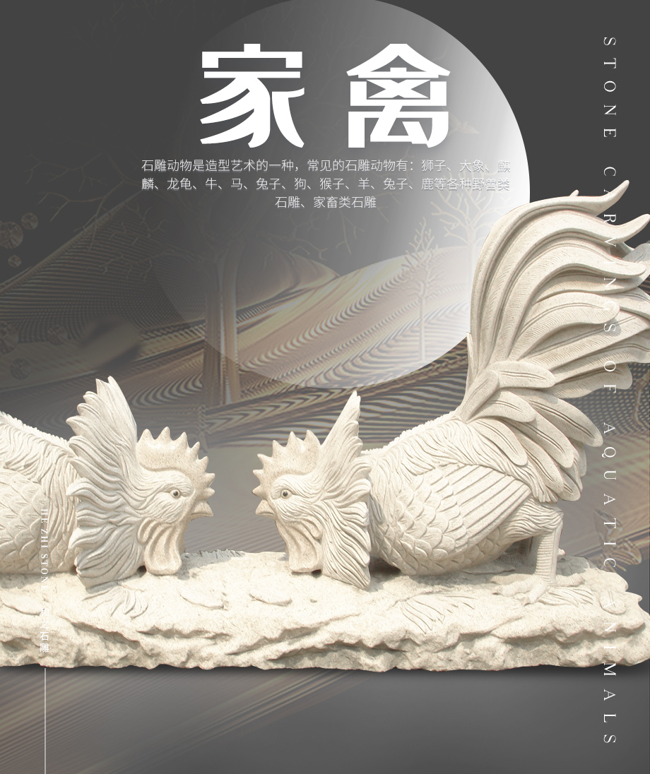 此款石雕公雞采用的是花崗巖石材雕刻而成,底座也不只是簡單的光滑底板,采用圓雕,深雕與浮雕結(jié)合雕刻。石雕公雞中的“雞”與“吉”諧音,因為雞自然就成為了吉祥幸福的象征。