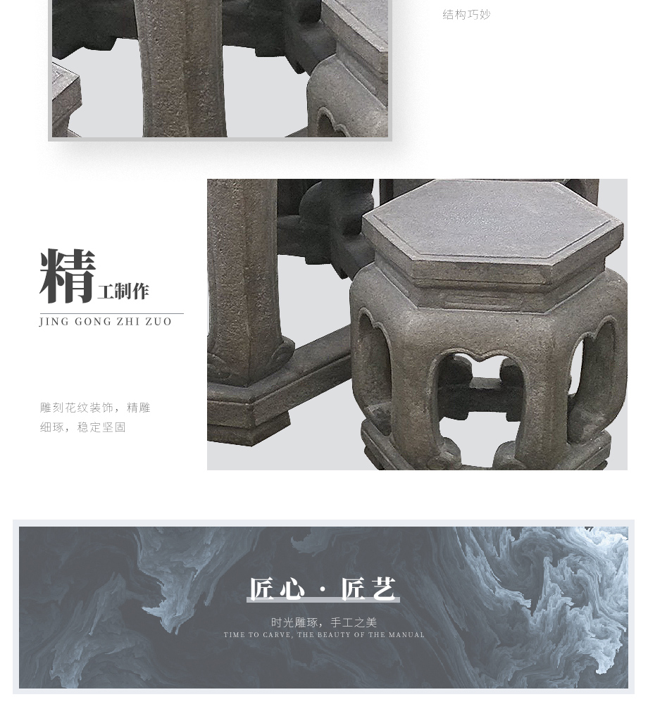 整體造型方面,采用中式古典風(fēng)來完成,色彩方面,后期石材進(jìn)過仿古處理,所以外表看起來古樸,這種古樸中式的桌椅和很多古建景點的藝術(shù)風(fēng)格和景觀相搭配,所以我們會把這類作品放在古老的景區(qū),寺廟,中式園林景觀,中式庭院等地方擺放,第一可以增加整體的一個文化元素,第二也可以供人累了休息片刻。