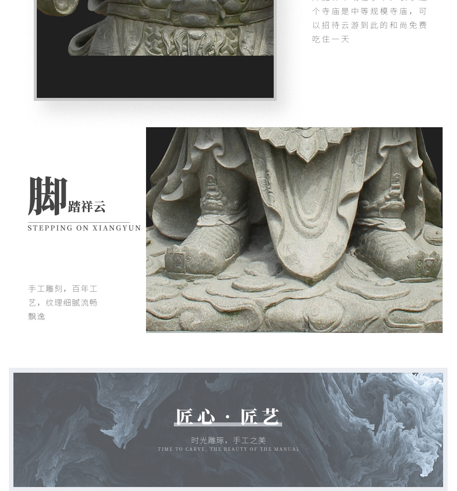 由我廠福建惠安和之園林古建公司專業(yè)生產(chǎn)加工的這一尊花崗巖韋陀菩薩像,做工精湛,質(zhì)量上乘,石頭選用福建本地純天然優(yōu)質(zhì)石材,利用花崗巖優(yōu)良的特性,石料堅(jiān)硬密實(shí),耐磨損,高強(qiáng)度的耐熱性和幾乎為0的滲透性,有很好的抗腐蝕性,石材吸水率低,顆粒均勻細(xì)密,是雕刻露天佛神雕像的優(yōu)質(zhì)石材。加工工藝以惠安石雕圓雕為主,浮雕為輔,外觀打磨細(xì)致,整體比例標(biāo)準(zhǔn),傳神生動(dòng)。