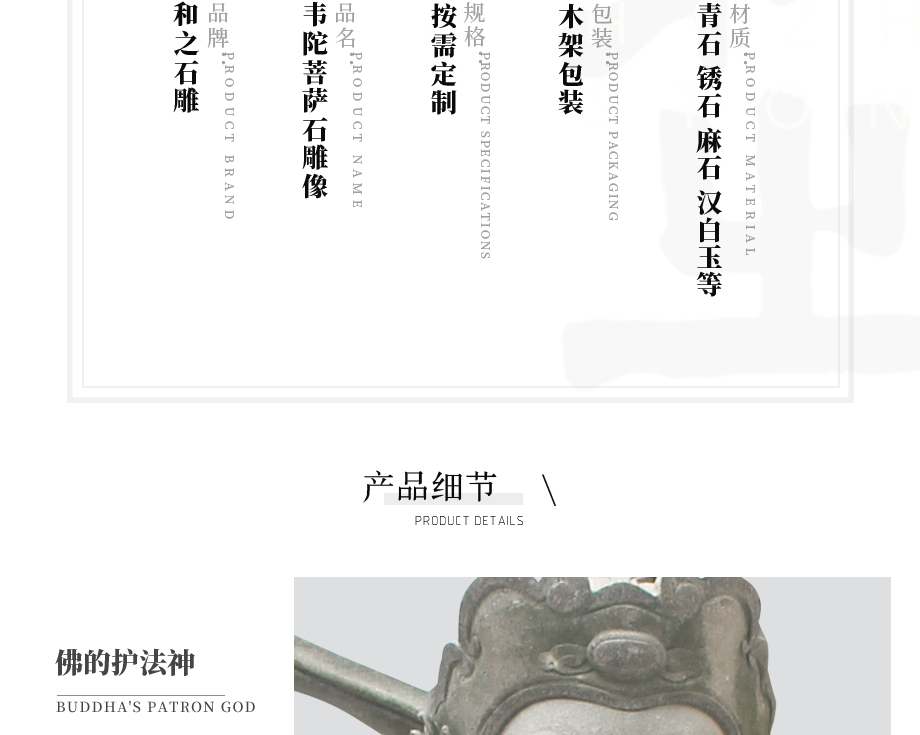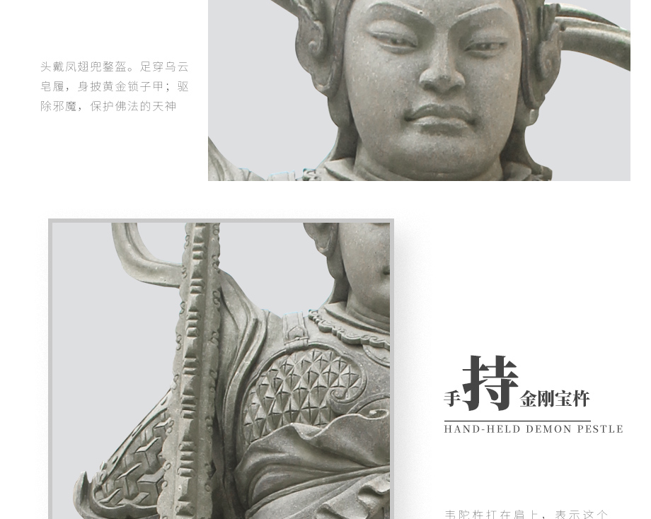 韋陀菩薩是佛教的護(hù)法菩薩,寺廟供奉韋陀菩薩保佑功用是可以護(hù)持佛法,保護(hù)寺院僧眾。韋陀像定制通常選用花崗巖石材雕刻,福建惠安和之園林古建公司加工石雕韋陀像形態(tài)逼真生動(dòng),各種形態(tài)韋陀像尺寸標(biāo)準(zhǔn),支持韋陀菩薩圖片設(shè)計(jì),價(jià)格合理,免費(fèi)報(bào)價(jià)。