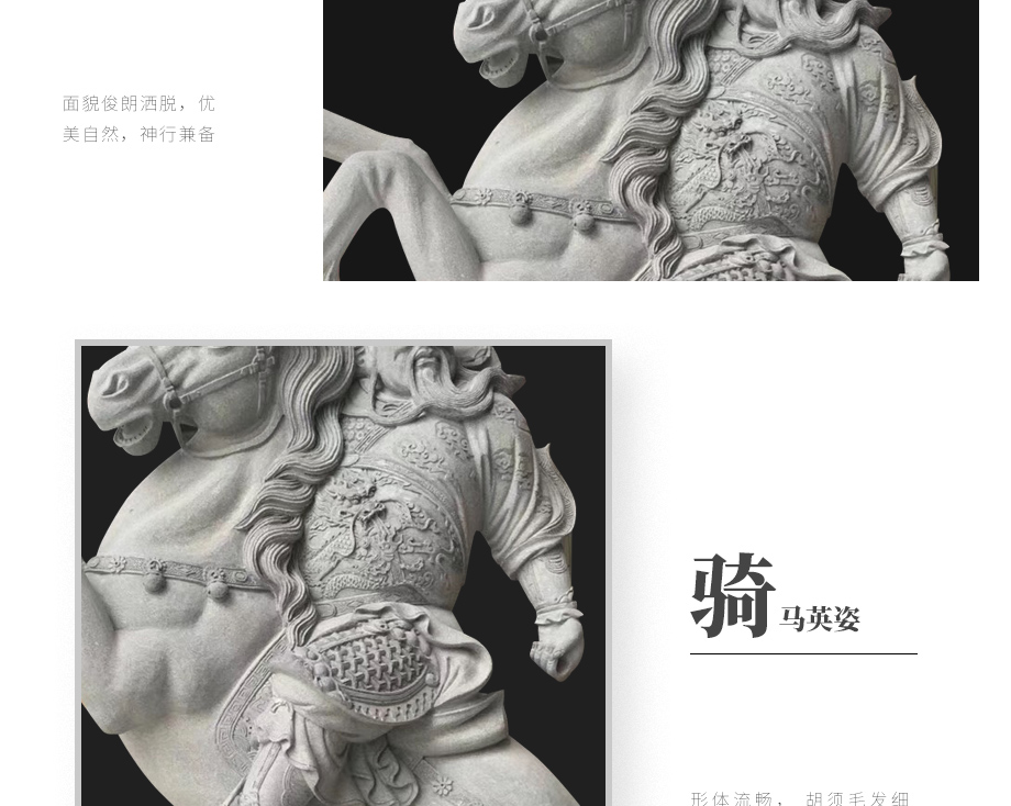 這尊關(guān)公像雕刻精美絕倫,關(guān)公面相威嚴(yán),目視前方,提刀跨馬,戰(zhàn)袍盔甲,身姿挺拔,不管是關(guān)公本尊還是這批汗血寶馬的雕刻都是極為精致的,關(guān)公披身像武袍雕工條紋精細(xì)入微,身體姿勢(shì)動(dòng)感十足,美須隨風(fēng)飄動(dòng),服飾隨著身體動(dòng)態(tài)的表現(xiàn),自然流暢,真實(shí)感很強(qiáng)。加工方式以復(fù)雜的浮雕工藝結(jié)合圓雕鏤雕等呈現(xiàn)整尊關(guān)公像的立體空間感。關(guān)公像造型比例,結(jié)構(gòu)準(zhǔn)確,身形姿勢(shì)威武,更重要的是將石雕關(guān)帝騎馬像的英勇氣勢(shì)展現(xiàn)得淋漓盡致,形神兼?zhèn)?,栩栩如生。再看這匹汗血寶馬雕塑,身上毛發(fā)絲絲明顯卻又表現(xiàn)得柔順,寶馬身上肌肉健壯厚實(shí),在裝飾上以簡(jiǎn)單的鈴鐺帶作飾物,簡(jiǎn)約美觀。底座雕刻花紋圖案,結(jié)合整座石雕關(guān)公騎馬像,充分融入現(xiàn)代美學(xué)元素,使作品更符合現(xiàn)代審美的生動(dòng)性。