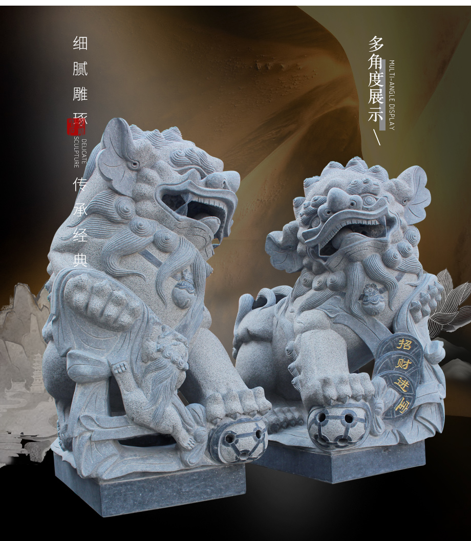 本產(chǎn)品的石雕獅子是是由一個高60公分的底座和高1米左右的獅子組合而成,整體高度在1.6左右,采用的是芝麻黑的石材雕刻而成,我們看到有兩種色彩顏色,是因為部分通過拋光,才形成兩種不同色彩,石獅子在凹凸方面需要根據(jù)石材的光面,亞光,自然面的色彩的不同而加工出陰影效果,局部陰影效果非常強,這樣才有明顯的對比,立體感也會很完美。