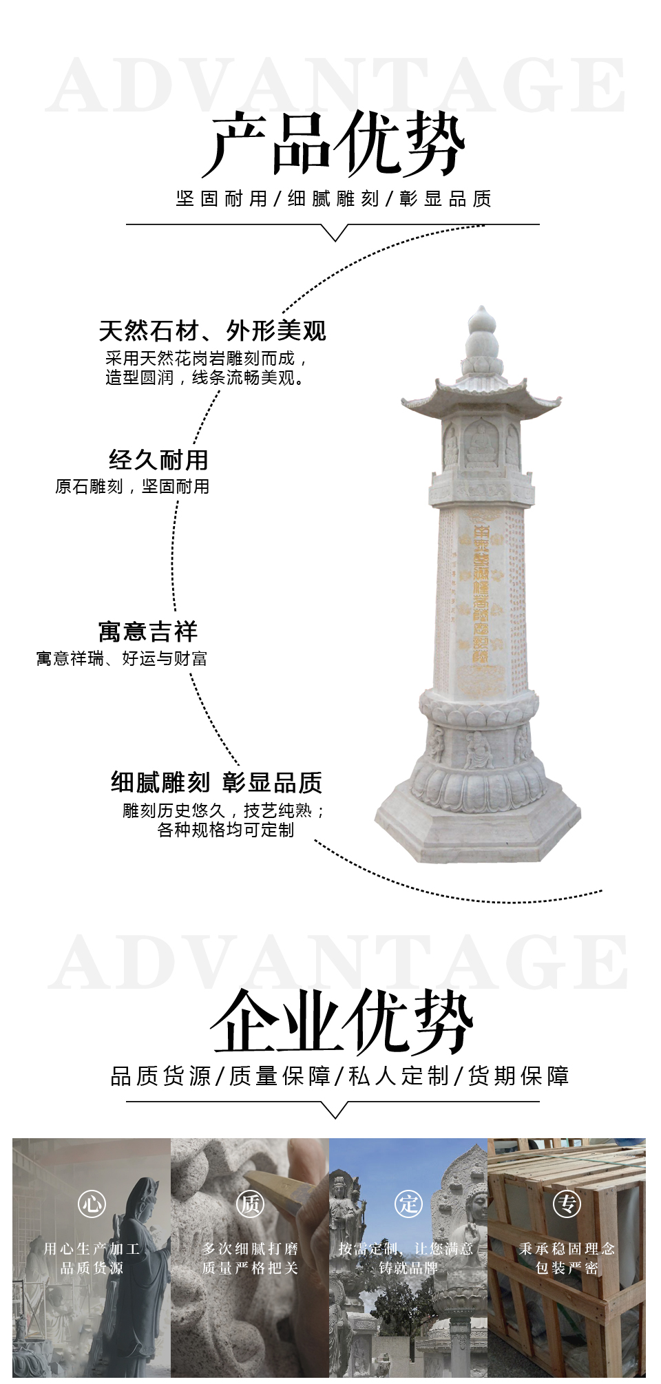 在寺院建筑中,石雕經(jīng)幢是一種重要的石雕建筑,是一種帶有宣傳性和紀(jì)念性的石雕建筑,分別為基座、幢身和幢頂?shù)?。寺廟石雕經(jīng)幢蘊(yùn)含著佛教文化的很多內(nèi)容,它不僅傳播了佛教文化,而且還未建筑設(shè)計(jì)帶來了更大的靈感。此款石雕經(jīng)幢塔由大理石石材加工而成,高度在3米左右,在結(jié)構(gòu)…