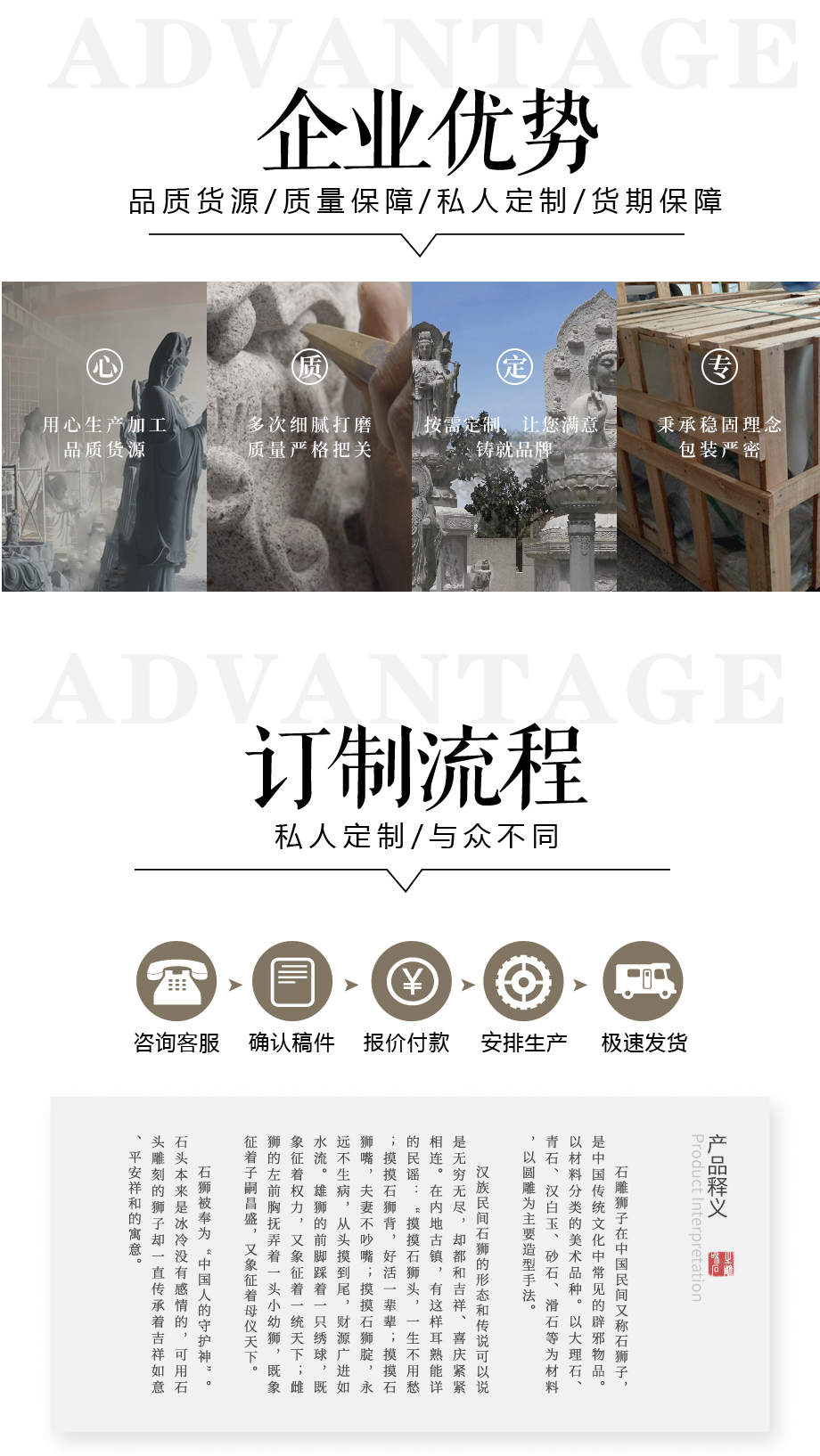 石獅子的選擇,可以根據(jù)材質(zhì)不同,以及擺放的作用而選擇,獅子款式有很多,可以根據(jù)自己喜歡的樣式去設(shè)計(jì),
