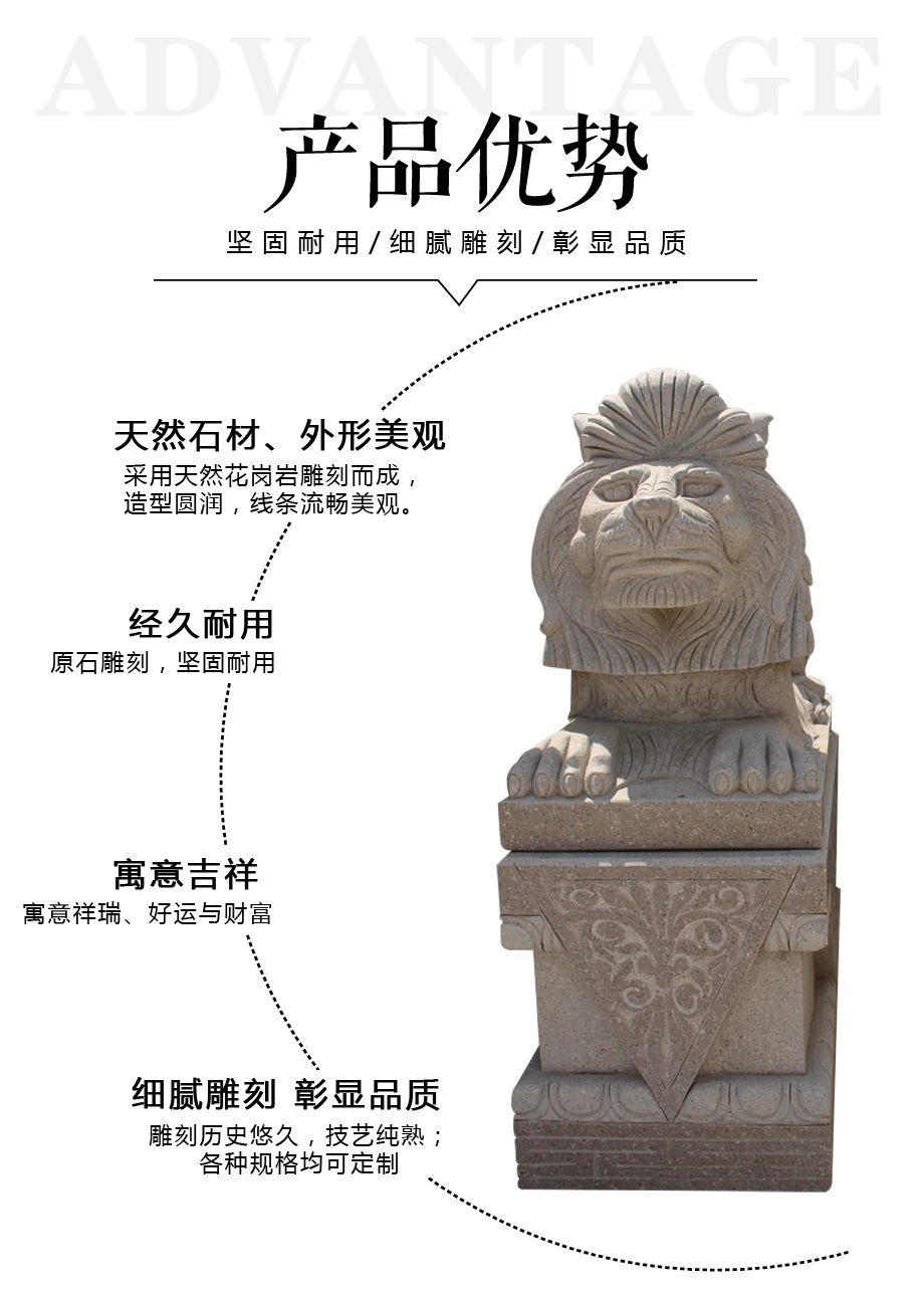 石雕獅子高度在1.8米左右,其中一只獅子是張開嘴巴,一只獅子是閉著嘴巴,這也是港幣獅子的一個特點。一般雄獅子嘴巴張開,寓意招財進寶,而雌獅子著閉著嘴巴,寓意守財之意,也是比較適合用于在銀行門口外的擺放。在底座方面,采用的是線雕的工藝,雕刻出一些紋理以及一些花紋圖案,讓整個底座看起來沒那么單調(diào)。只有好的工藝,才能將一對石雕獅子雕刻得具有靈性,形象如真的擺放在人們面前。
