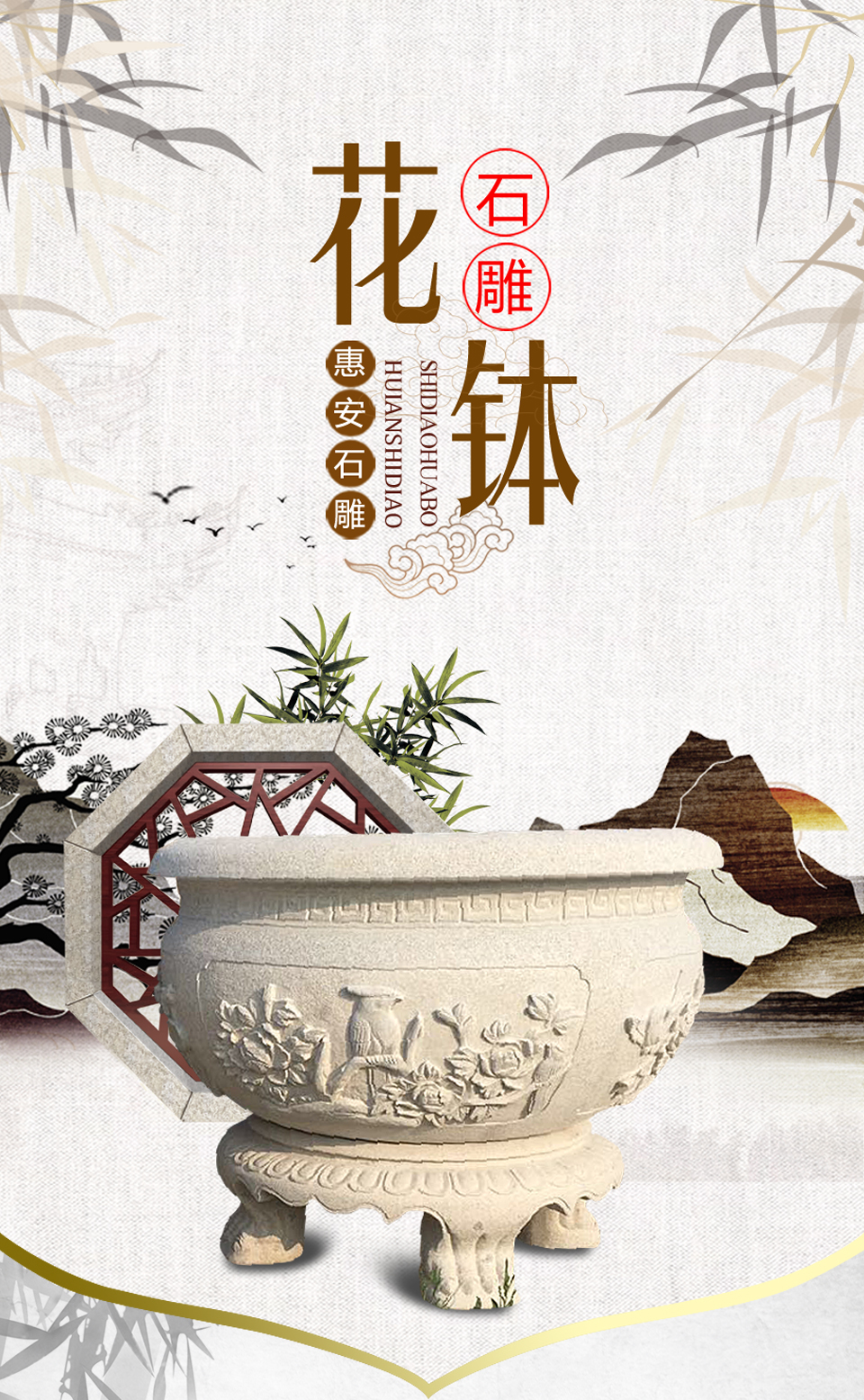 石雕花缽,也叫做石雕花盆,是種花用的器皿,為口大底端小的倒圓臺(tái)或倒棱臺(tái)形狀?;ɡ徶谱魇目梢允腔◢弾r,砂巖,銹石,大理石,芝麻白,莆田銹石等。