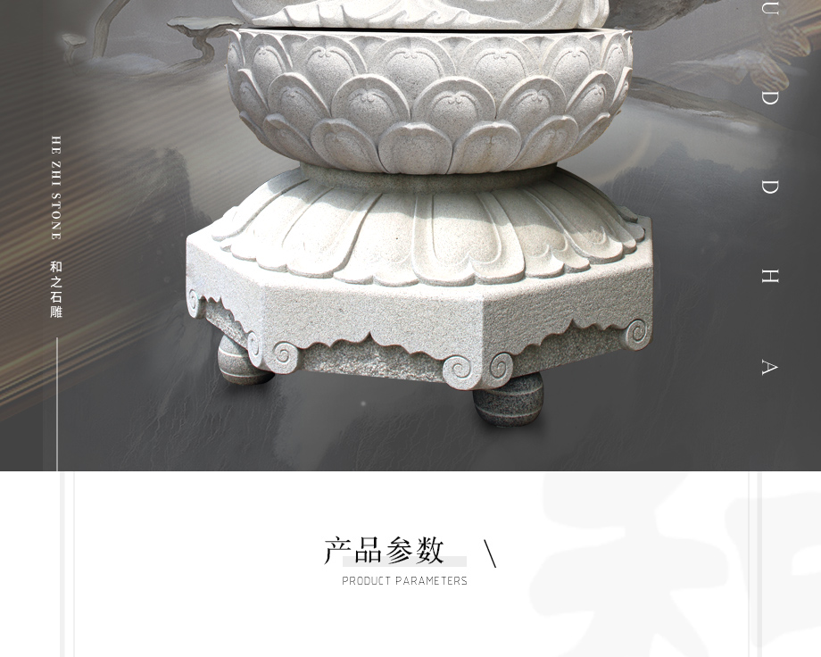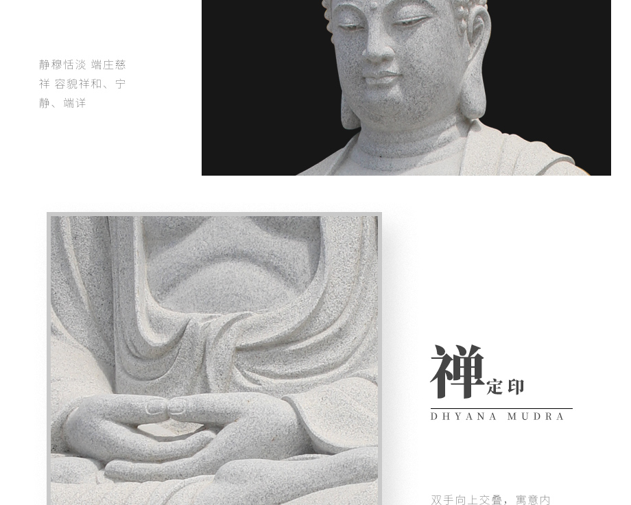 花崗巖石材是福建石雕佛像廠家常用的雕刻石材之一,也是很多寺廟選擇恭造佛像塑像的首選石材之一,花崗巖的優(yōu)良物理特性和高性價比是其成為雕刻佛教佛像神像的主要原因。本產(chǎn)品石雕釋迦牟尼佛陀神像就采用芝麻白花崗巖石料,如來佛祖石雕像面態(tài)祥和,盤坐于雙盤蓮花底座之上,作禪定狀,俯視著眾生,胸口的萬字符采用浮雕的工藝手法雕刻,整尊石雕佛像和蓮花底座結(jié)合,將石雕釋迦牟尼佛的莊嚴(yán)寶相展示的更加淋漓盡致。