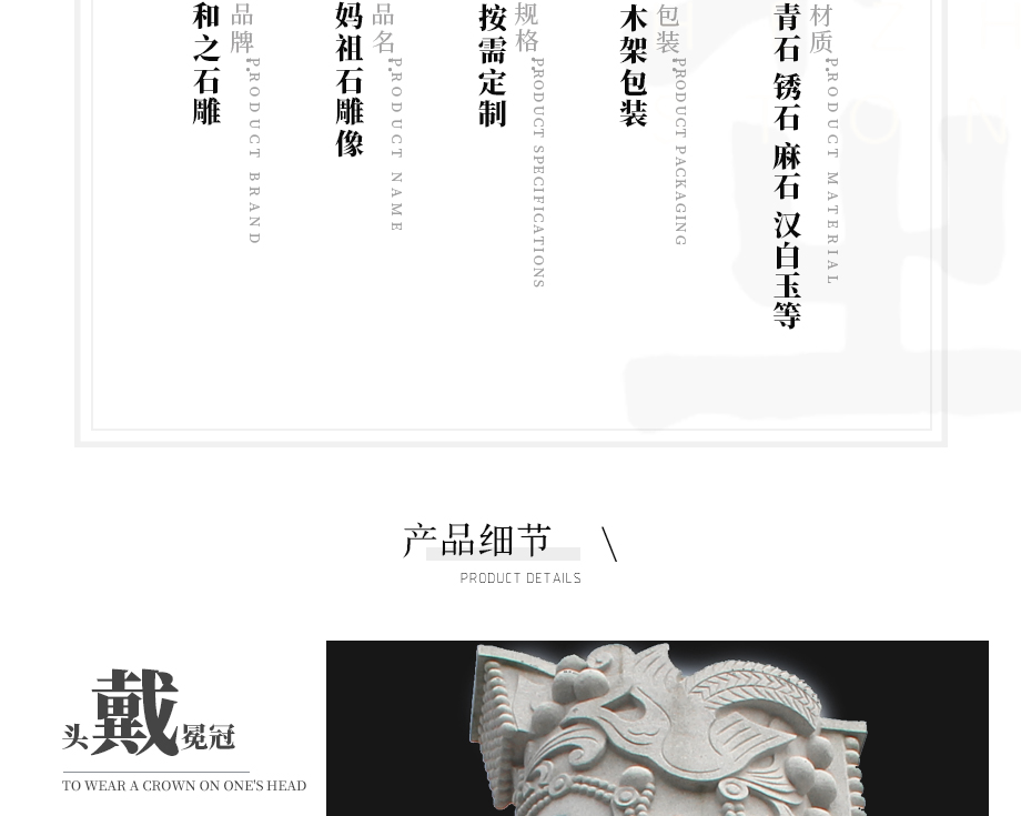 福建莆田大型媽祖石雕像是文明國內(nèi)外的海神雕像,雕刻采用福建本地優(yōu)質(zhì)石材白麻石加工,大型媽祖像供奉在沿海一岸守護著來往的船工、海員、旅客、商人和漁民,海洋文化史中最重要的漢族民間信仰崇拜神之一。石雕媽祖像頭戴冕旒,身著霞帔,手持玉如意,儀態(tài)雍容,表情莊重,是…