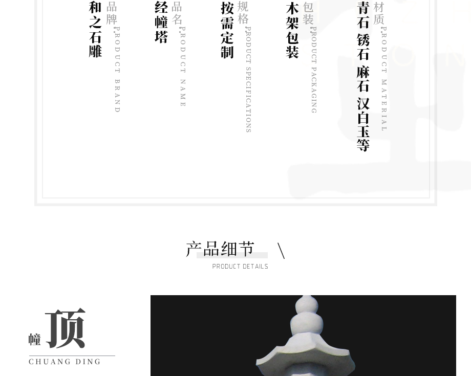 此款石雕經幢由幢頂、幢身和基座三部分組成,主體是幢身,刻有佛教密宗的咒文或經文、佛像等,幢身多呈六角或八角形。此款經幢采用花崗巖雕刻而成,幢身雕刻著陀羅尼經文有避災消難的含義,擺放在寺廟園林之中有宏揚正法、消弭災禍含義。我們和之園林古建專業(yè)雕刻石雕經幢塔,可來圖定制,歡迎來電咨詢。