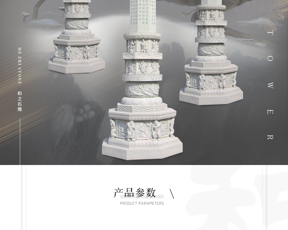 寺廟石雕擺件多為花崗巖,其堅硬耐腐蝕的石材特性是石雕雕刻的首選。雕刻技藝相對較好的廠家多數(shù)都集中在惠安,出售各種大中小型經(jīng)幢石擺件,用料講究,雕技高超,經(jīng)幢塔是宗教廟宇中必備的石雕擺件,是一種帶有宣傳性和紀(jì)念性的藝術(shù)建筑。此款六棱石經(jīng)幢以天然芝麻白花崗巖為加工主體材料,基座的浮雕佛像,幢頂?shù)奈蓍苁綄氻敿按鄙淼某恋窠?jīng)文,均由惠安優(yōu)秀的石雕藝人手工打造而成,整體造型給人一種肅穆崇敬之感。