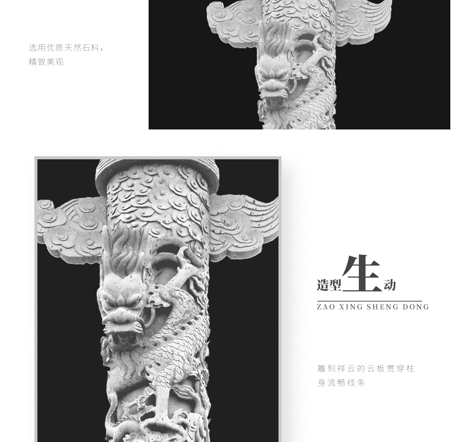 青石是寺廟石雕配件的首選石材之一,顏色給人一種古樸氣息與宗教寺廟那種文化氛圍較為相近。為了更能彰顯龍的威風(fēng)和氣勢(shì),此款龍柱采用青石雕刻,運(yùn)用到浮雕圓雕鏤空雕等工藝手法,使得龍身上的每一塊鱗片(浮雕)都清晰可見,龍爪蒼勁有力(鏤空)。