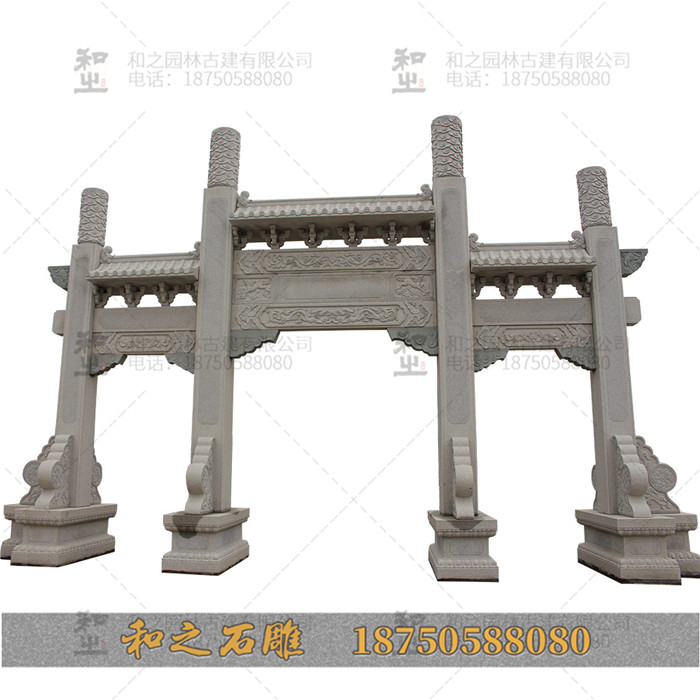 石雕牌坊的形狀也是設(shè)計的元素,客戶可選擇多種造型:一門簡易、一門一樓、一門三樓、三門簡易、三門三樓、三門五樓、三門七樓、五門簡易、五門五樓、五門七樓、五門九樓、五門十一樓等??梢钥吹贸鰜砼品坏囊?guī)律都是按照奇數(shù)來遞增的,主要是中國文化造成的,人們用奇數(shù)表示陽,而偶數(shù)表示陰,所以一般我們可以看到,陵墓附近的牌坊都是偶數(shù)的門樓,并且奇數(shù)在中國有著更深遠的寓意,一是數(shù)字之始,也是排名最靠前的數(shù)字,代表的是地位,也代表是榮耀,三在中國文化中的三生萬物,是萬物的發(fā)源數(shù)字,表達的也是萬物,三門表示萬物之門。五是中國五行的寓意,五行表達了萬物的元素。而七則是北斗七星,表達了方向和方位。九則是和五形成九五之尊,九鼎九州是國家權(quán)重的象征。