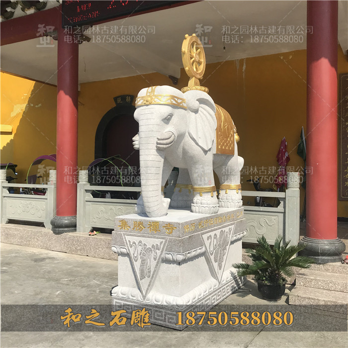 溫州集勝禪寺石雕大象初次聯(lián)系是在2018年年底,經(jīng)好幾位師父、居士一番詢價(jià),討價(jià)還價(jià)后,還是沒(méi)能在年前定下來(lái)。殊不知,這年一過(guò),石材價(jià)格猛漲,原先談定的價(jià)格已然大幅上漲,廠家再也無(wú)力按原材料加工相應(yīng)成品出來(lái)。好在師父、師兄們都還善解人意,適當(dāng)補(bǔ)償了一些給和之石雕廠,工廠才得以在幾乎接近成本的基礎(chǔ)上,順利地完成了一對(duì)令大家都滿意的六牙石雕大象。石雕大象采用福建泉州白石加工(已經(jīng)封礦),此石材屬花崗巖石系列,堅(jiān)硬無(wú)比,磨光后表面呈現(xiàn)淡紅色,中間夾雜少量的黑白點(diǎn)。該對(duì)六牙石雕大象是從審美學(xué)的角度進(jìn)行設(shè)計(jì),對(duì)大象身體部分區(qū)域進(jìn)行涂金,讓大象顯得更加神圣,而不是普通的一對(duì)招財(cái)石象而已。在陽(yáng)光的照耀下,這一對(duì)石雕大象分外的耀眼。
