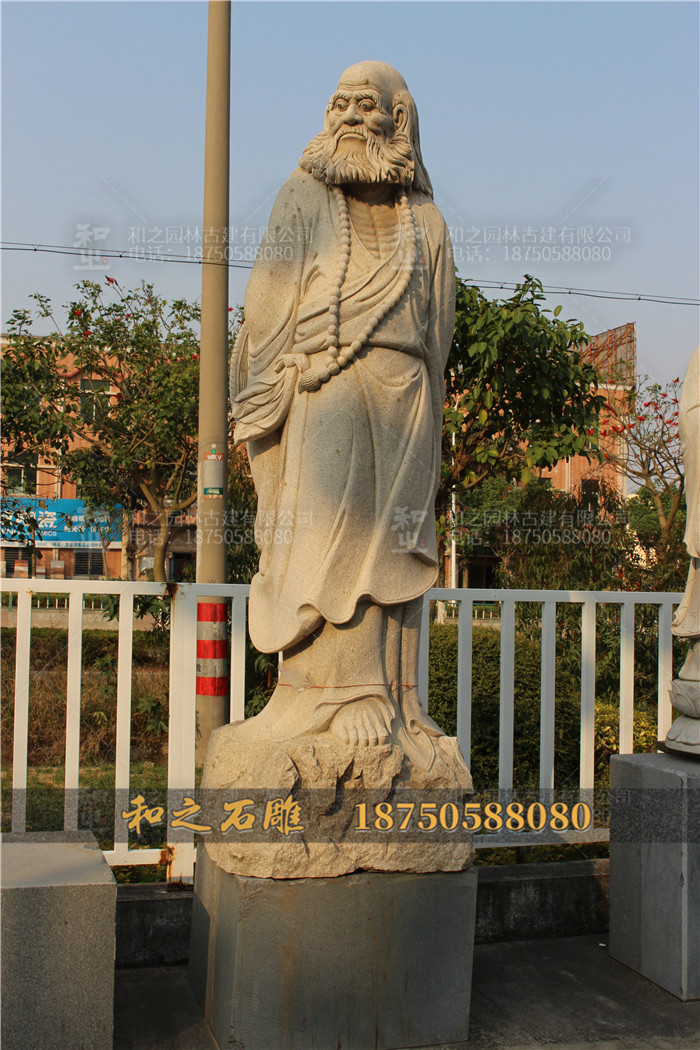 戶(hù)外大型的達(dá)摩石雕像所采用的石材則通常是天然花崗巖,如福建芝麻白、湖北芝麻白、江西芝麻白以及漳州芝麻黑等。禪宗祖師達(dá)摩的外觀造型有沙門(mén)相,也有一種俗人造型。達(dá)摩祖師像雕塑表面的處理辦法一般都是盡可能地不做太精細(xì)的處理,而是通過(guò)構(gòu)思讓人咋一看是粗獷,仔細(xì)看又別有洞天的感覺(jué)。達(dá)摩祖師石雕像最常見(jiàn)的就是“地中?!笔筋^型,有行走像、參禪像、禪定像等等,許多人的茶桌、辦公桌都會(huì)擺放一些小型的達(dá)摩祖師像的工藝品擺件。