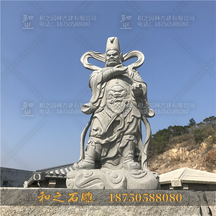 花崗巖招杜羅神將石雕像,招杜羅意譯為執(zhí)動(dòng),其意思是嚴(yán)幟、殺者;另名照頭羅,其意思是月光、月色。招杜羅神將威嚴(yán)起來就像是要?dú)⑷艘粯樱鍍羝胶蜁r(shí)又像是月色一樣??芍^是靜如處子,動(dòng)如脫兔。招杜羅神將的法身為金剛手菩薩,是丑時(shí)之守護(hù)神。通身全白色,現(xiàn)忿怒形,頭戴牛冠,右手把橫劍,左手開掌執(zhí)劍尖,其神態(tài)威武莊嚴(yán)。