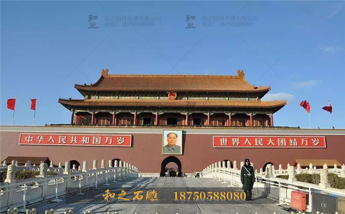 天安門也是皇帝舉行“頒詔”儀式的地方,凡大的慶典如皇帝登極、冊立皇后等都要在天安門城樓上舉行“頒詔”活動。我國古代宮殿都非常重視宮城前方的布局規(guī)劃。早在唐、宋時期,即于皇城的南面開出一條御路馳道,稱“朱雀街”,以襯托出皇宮的氣魄。金、元以來又有了宮前的千步廊,以豐富宮殿前區(qū)的建筑內(nèi)容。明、清兩朝紫禁城宮殿的前方沿襲前代的布局,并進一步擴展其規(guī)模,即由天安門向南引出大片空地形成“凸”形廣場,以顯示和突出天安門的重要地位。