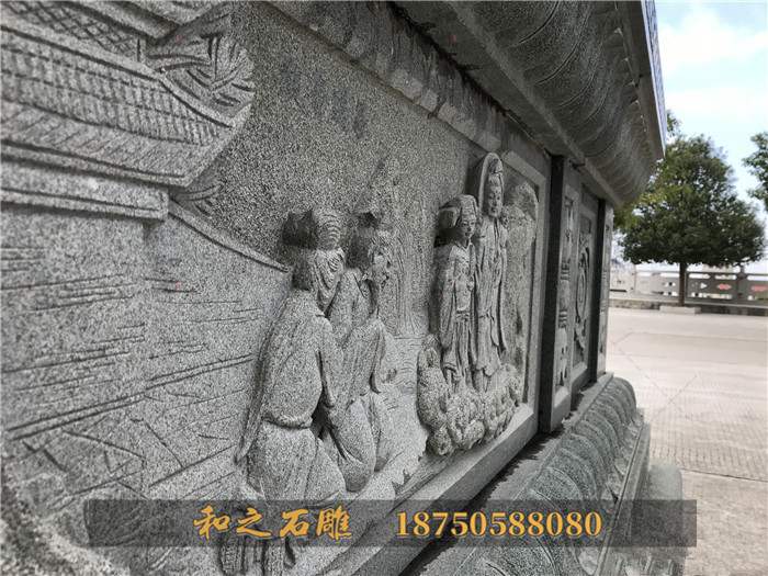 須彌臺的束腰部分,為浮雕圖案,四面分別刻有觀音送子圖,觀音見佛祖圖,童子拜觀音與觀音普度眾生圖等,圖案浮雕深度為2-3公分,立體效果極強(qiáng),雕刻圖案中人物,山水,花葉,樹木,房屋,云霧等層次分明,結(jié)構(gòu)設(shè)計緊湊,古樸典雅,美輪美奐。上梟和下梟部分為蓮花貼片造型。