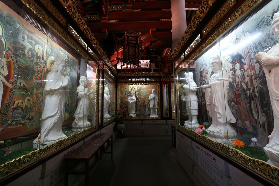 整座寺廟的結(jié)構(gòu)造型,中軸為照墻、山門、天王殿、藏經(jīng)樓、玉佛樓。東側(cè)為客堂、地藏閣、五觀堂、香積廚、齋堂、僧舍、不俗精舍、祖堂。西側(cè)為方丈室、觀音閣、慧業(yè)堂、僧舍、云水堂、諸天閣、形成寵大的四合院式古建筑群。