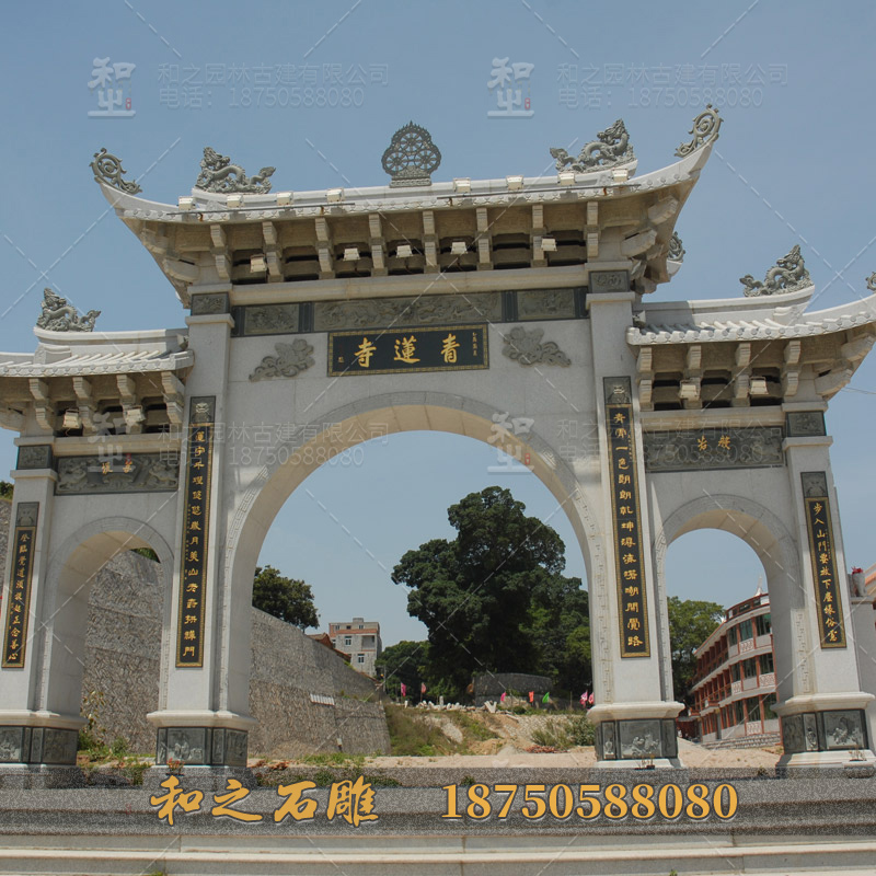 寺院寺廟石雕牌坊制作-石雕山門牌樓,在中國(guó)的佛教道教寺院建設(shè)中,因其深受中國(guó)傳統(tǒng)建筑群體空間觀影響,佛教寺院寺廟強(qiáng)調(diào)的空間,是建設(shè)群所在整體寺院空間。從寺院外部通往寺廟主體建筑群,通常會(huì)有一個(gè)前導(dǎo)部分,即是寺院山門牌坊。寺院寺廟牌坊既是主要的交通通道,石牌坊又是整個(gè)寺觀空間序列的前奏曲。從建筑學(xué)的意義上看,石雕山門石牌坊這樣的寺院牌坊,是建筑軸線序列的開端,引人入勝,醞釀空間高潮,預(yù)示著后面建筑序列的豐富多彩。如洛陽白馬寺主要建筑位于南北向的中軸線上,依次為山門牌坊、天王殿、大佛殿、大雄殿、接引殿、清涼臺(tái)、毗盧閣和齊云塔院的齊云塔。寺院寺廟山門牌坊制作形體,由在豎向上支撐和傳遞荷載的立柱,與橫向上聯(lián)系的梁枋架構(gòu)而成的門洞式建筑,屬于傳統(tǒng)的牌坊建筑。寺院石牌坊制作中,除了部分加以檐樓豐富外部形態(tài)特征外,也不乏各種小構(gòu)件,如斗拱、雀替、勾頭等,給石雕山門牌樓建筑,增添了獨(dú)特的藝術(shù)氣息。
