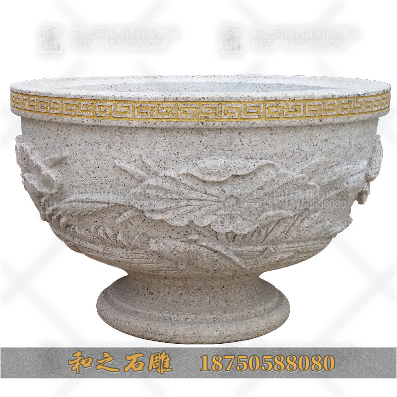 石材花缽在制作過程中常用到的素材都是天然石材,一般為花崗巖和少數(shù)大理石、砂巖,其中以花崗巖最為常見。常用的花崗巖石材種有黃銹石、黃金麻,這兩種石材的顏色與黃金的顏色,有財寶的象征寓意,對于偏愛象形諧音、講究風(fēng)水的中國人來說,對之非常喜歡。而這種顏色又與土地泥巴的顏色相接近,很好打理,因此在建筑景觀中使用頻率非常高。常見到的大理石一般為米黃系列大理石,這類大理石由于石材價格昂貴,通常會在一些相對高檔的小區(qū)中使用,以埃及米黃、西班牙米黃大理石花缽最常見。